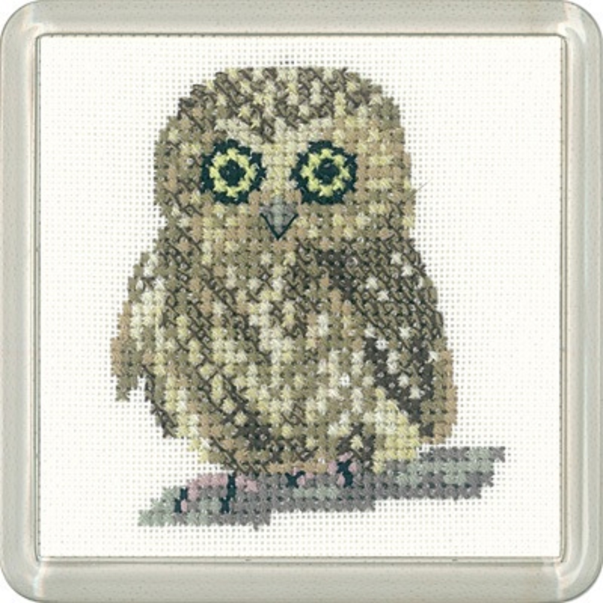 Heritage Crafts Little Friends - Owl Coaster Counted Cross Stitch kit. Kit contains 14ct Zweigart Aida fabric, Charts and instructions, Needle, DMC stranded Cottons and plastic coaster assembly. Approx Design size 6.5cm x 6.5cm (2.5" x 2.5").