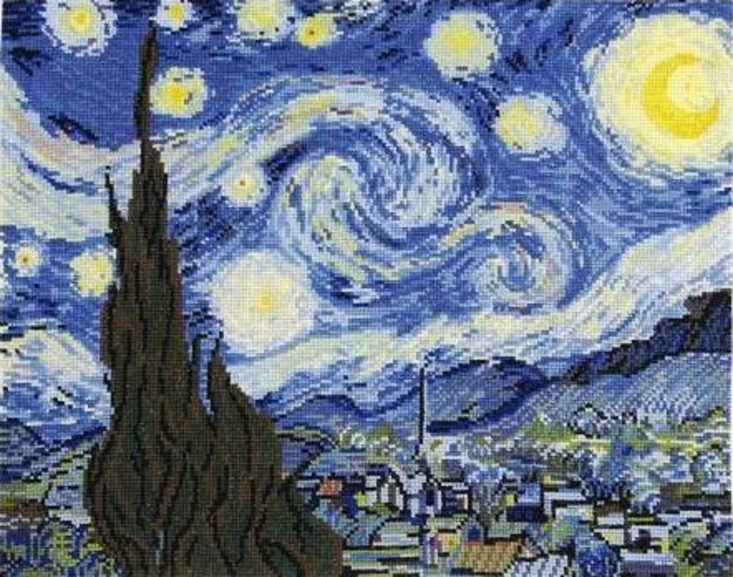 DMC Masters Collection - The Starry Night Counted Cross Stitch kit by Vincent Van Gogh. Design Size approx. 35 x 28cm (13.7 x 11"). Kit includes 14 count Aida, DMC 6-strand Mouline thread, needle, chart and instructions.