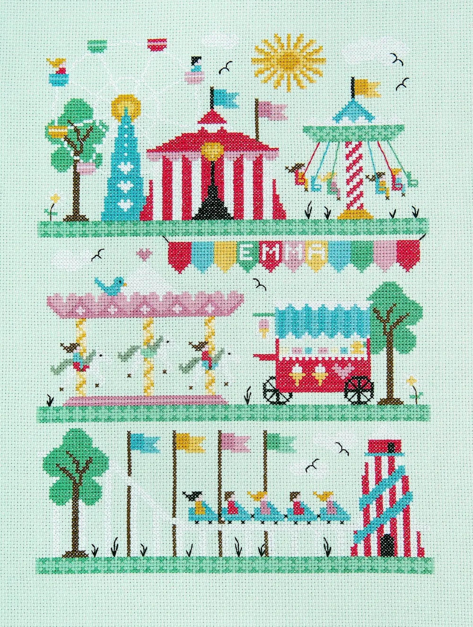 DMC BK2001 Funfair Counted Cross Stitch Kit by Little Dove Designs. Design size approx. 22cm x 30.3cm (8.7" x 11.9"). Kit includes 14ct aida, DMC 6 Stranded thread, Needle, Chart and Instructions.
