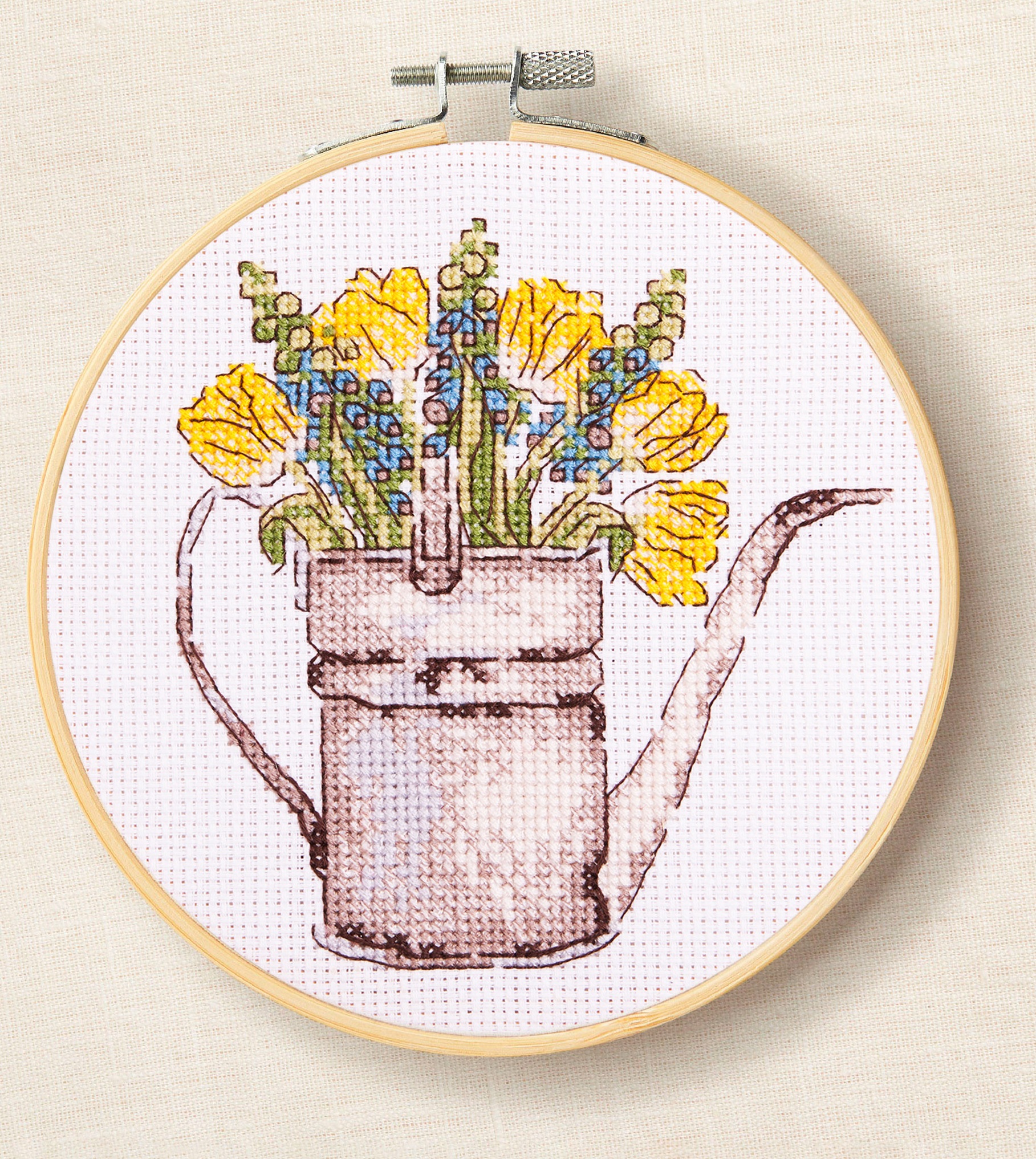DMC BK414 Sunshine Flowers Watering Can Counted Cross Stitch Kit by Anna Matvieieva. Design size approx. 14.5cm (5.7"). Kit includes 14ct aida, DMC 6 Stranded thread, Needle, Chart and Instructions. Kit also includes embroidery hoop.