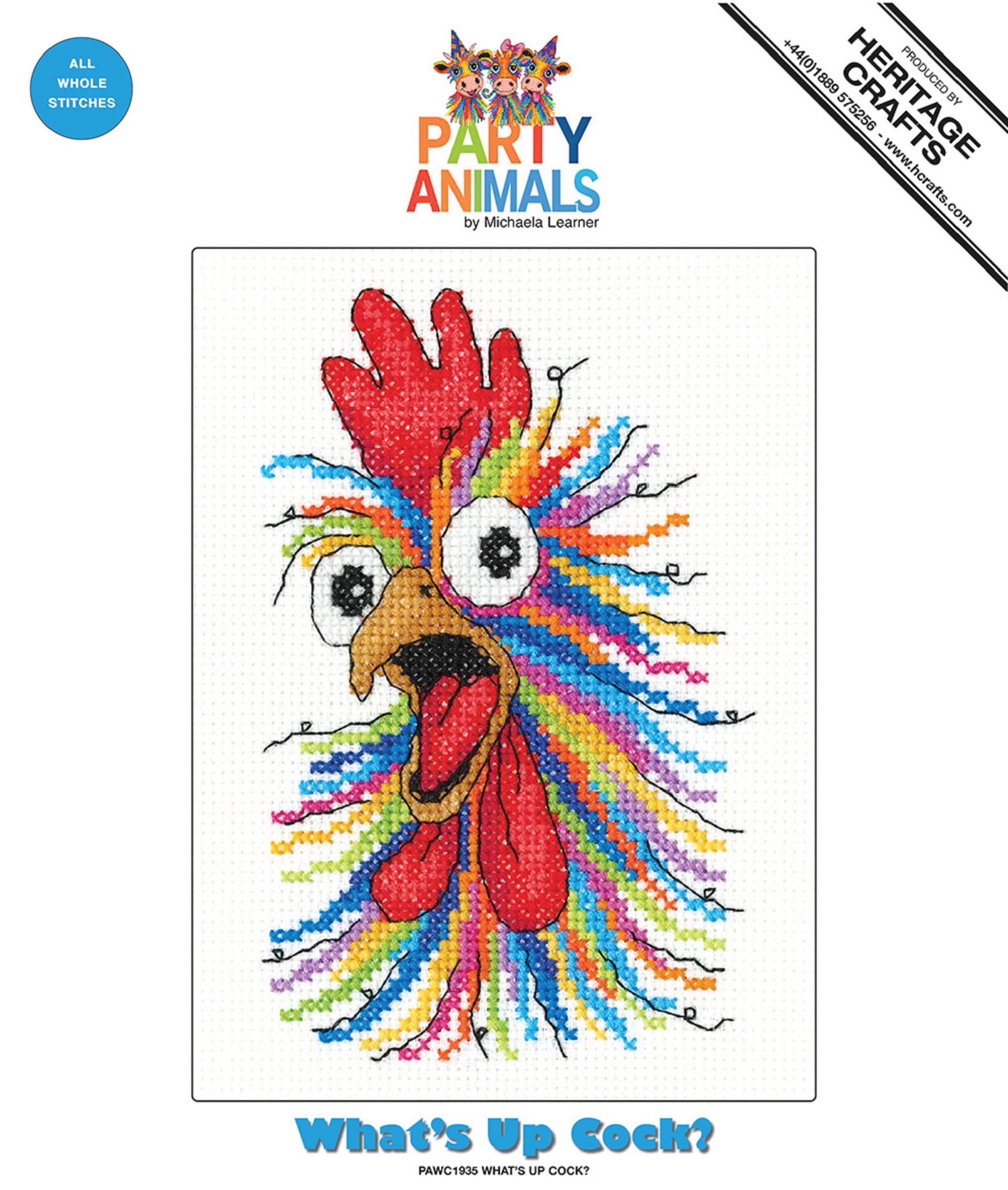 Heritage Crafts What's up Cock? Counted Cross Stitch kit from the Party Animal Collection. Design by Michaela Learner. Kit contains 14ct Zweigart Aida fabric, Charts and instructions, Needle and DMC stranded Cottons. Approx design size 9.5cm x 14.5cm (3.75" x 5.75").