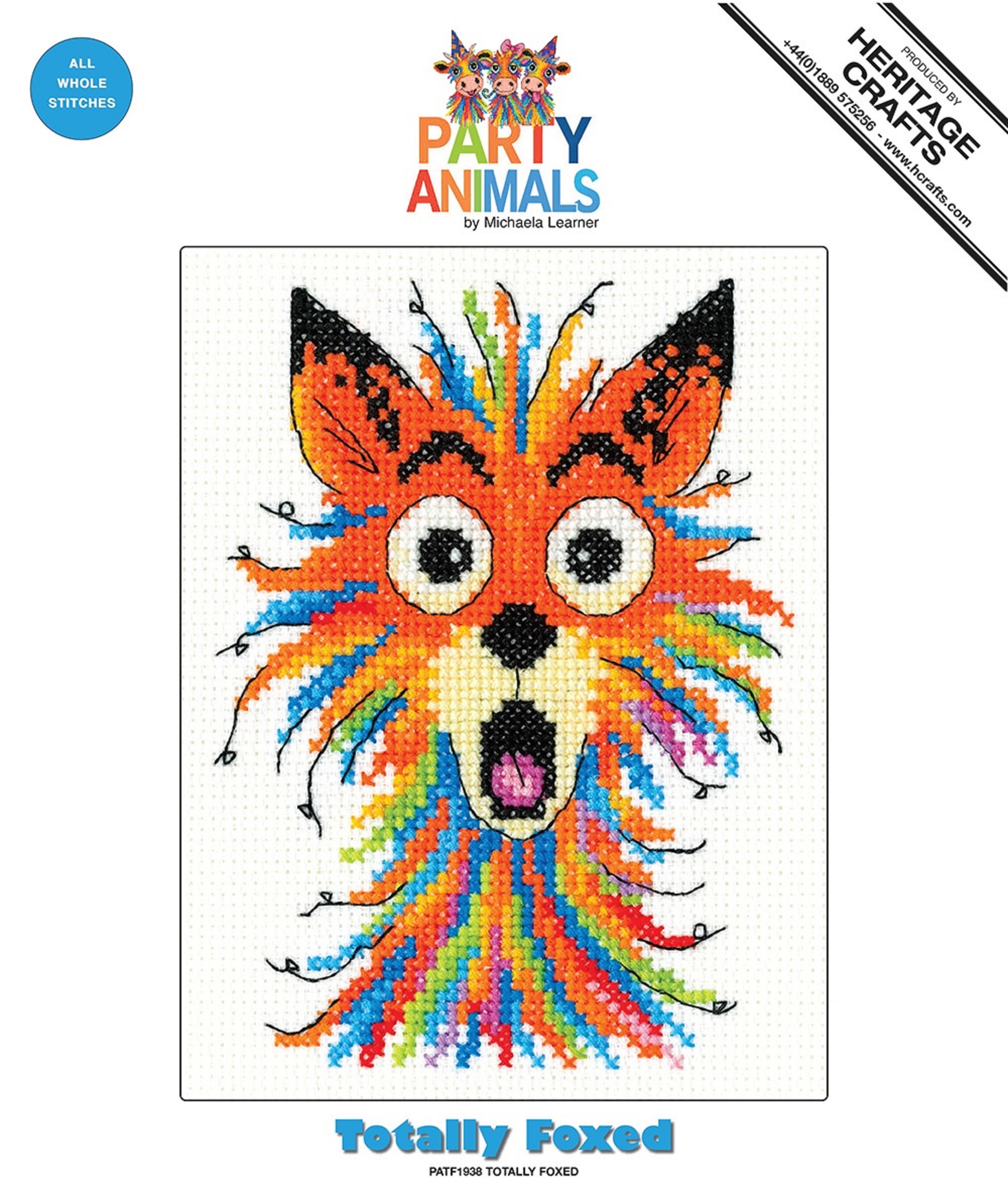 Heritage Crafts Totally Foxed Counted Cross Stitch kit from the Party Animal Collection. Design by Michaela Learner. Kit contains 14ct Zweigart Aida fabric, Charts and instructions, Needle and DMC stranded Cottons. Approx design size 10 x 13.5cm (4" x 5.25").